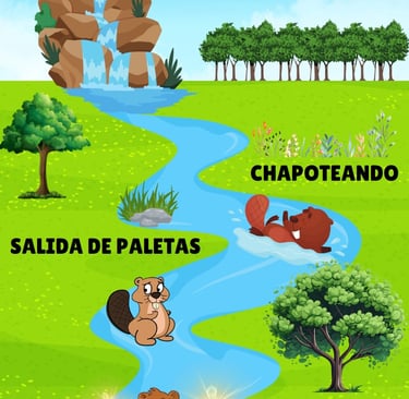 Chapoteando: esta es la primera fase, donde los castores se integrarán en la colonia. En esta etapa se hace entrega del cuaderno de chapoteo y de las colas de castor. Aquí, el castor o castora se compromete con la colonia